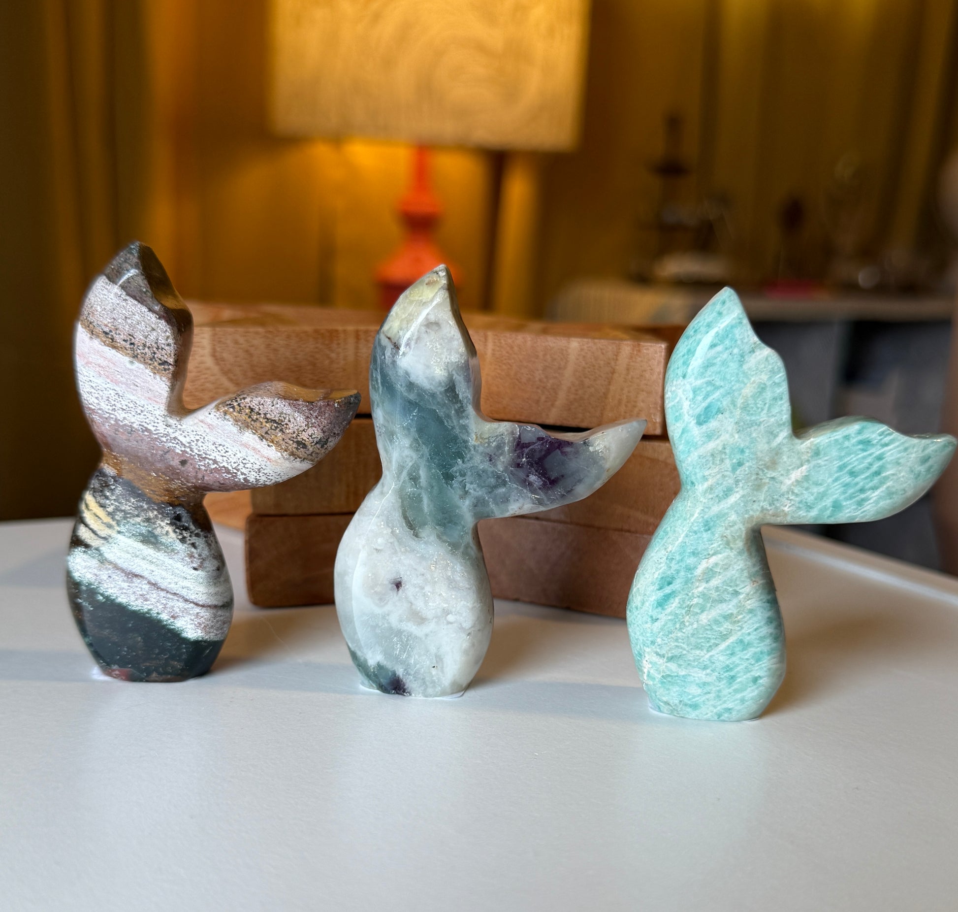 Explore our curated collection of crystal mermaid tails, each carved from a distinct gemstone to suit your spiritual practice. Choose fluorite for enhanced intuition and mental clarity, amazonite for soothing emotional energy and peaceful communication, or ocean jasper for grounding stability and nurturing vibrations. Each variety carries its own metaphysical signature while embodying the mystical essence of the sea. Whether you're building a crystal grid, enhancing your altar, or seeking a specific stone's properties, these mermaid tail talismans offer both aesthetic beauty and energetic support for your magical work.