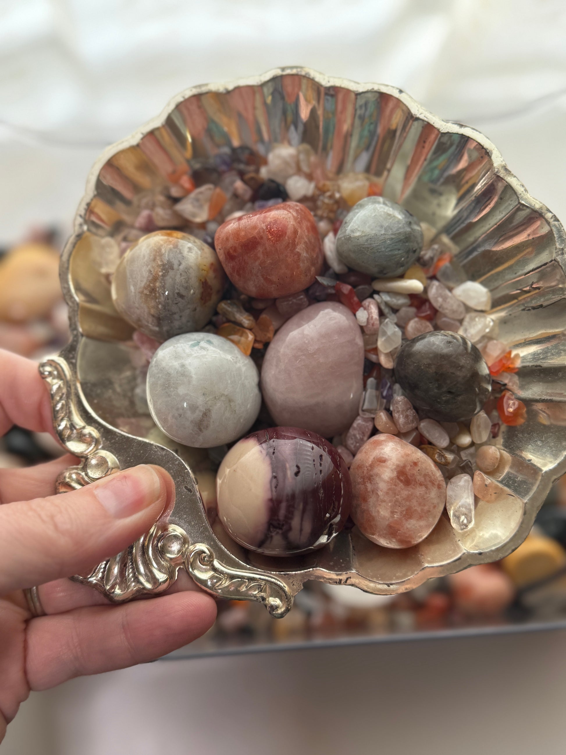 Carnelian, Citrine, Strawberry Quartz, Peach Moonstone, Earth Moonstone, Rutile, Flower Agate, Labradorite, Red Jasper, Sunstone, Rose Quartz, Rainbow Moonstone, Smoky Quartz, Amethyst, Mookaite Jasper (tumbles + flats)